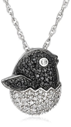 This just-hatched chick sparkles in black and white diamonds, and is sure to elicit plenty of smiles. The pendant is crafted in 925 sterling silver and dressed with a total of 102 black and white diamonds (1/2 cttw). It presents on an 18-inch sterling silver rope chain, finished with a spring ring clasp.