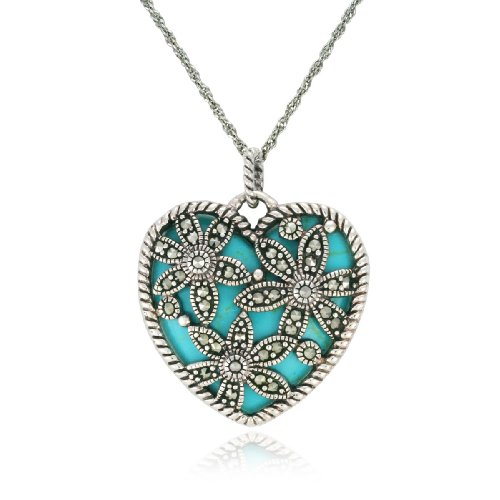 Cheap Sterling Silver Marcasite Flowers and Turquoise Heart Pendant, 18" Review